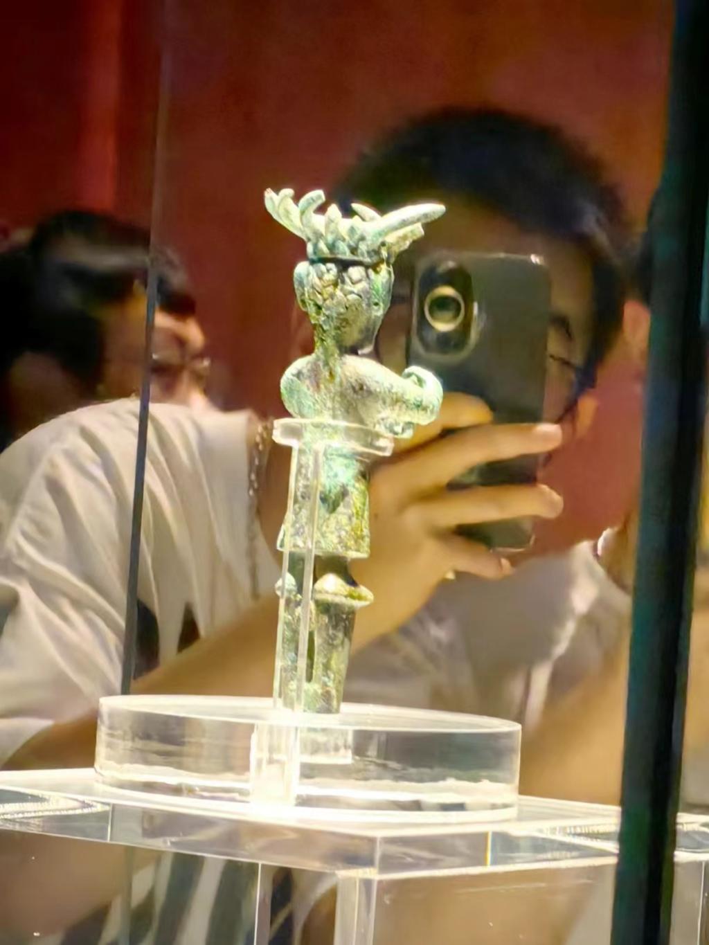 金沙遗址博物馆犹如一座时光隧道,将实践队员们带回到数千年前的古蜀文明。大家首先来到了遗迹馆。巨大的考古发掘现场展现在眼前,层层叠叠的文化堆积,形态各异的祭祀坑,岩石不断风化沉积,给古蜀文明蒙上了模糊厚重的纱,让人不禁感叹岁月的沧桑和历史的厚重。实践队员沿着木质栈道缓缓前行,仔细观察着每一处遗迹。讲解员生动地讲述着这些遗迹背后的故事,实践队员们听得入神,不时提出问题,与讲解员进行互动交流。讲解员的耐心回答,让实践队员更加了解了古蜀的历史文化。有的实践队员拿出笔记本,认真地记录着重要的信息;有的实践队员则用相机拍下这些珍贵的场景,以便日后进一步研究:有的实践队员表情凝重,陷入沉思,可能会在解说的某一刻停顿下来,思考其中的含义和价值,仿佛在内心深处与历史进行对话。接着,实践队员又跟随讲解员指引来到了“陈列馆”,从古老的文物到珍贵的艺术品,从历史的沧桑变迁到文化的传承发展,生动而详细的讲解,让那些沉默的展品仿佛都活了起来。