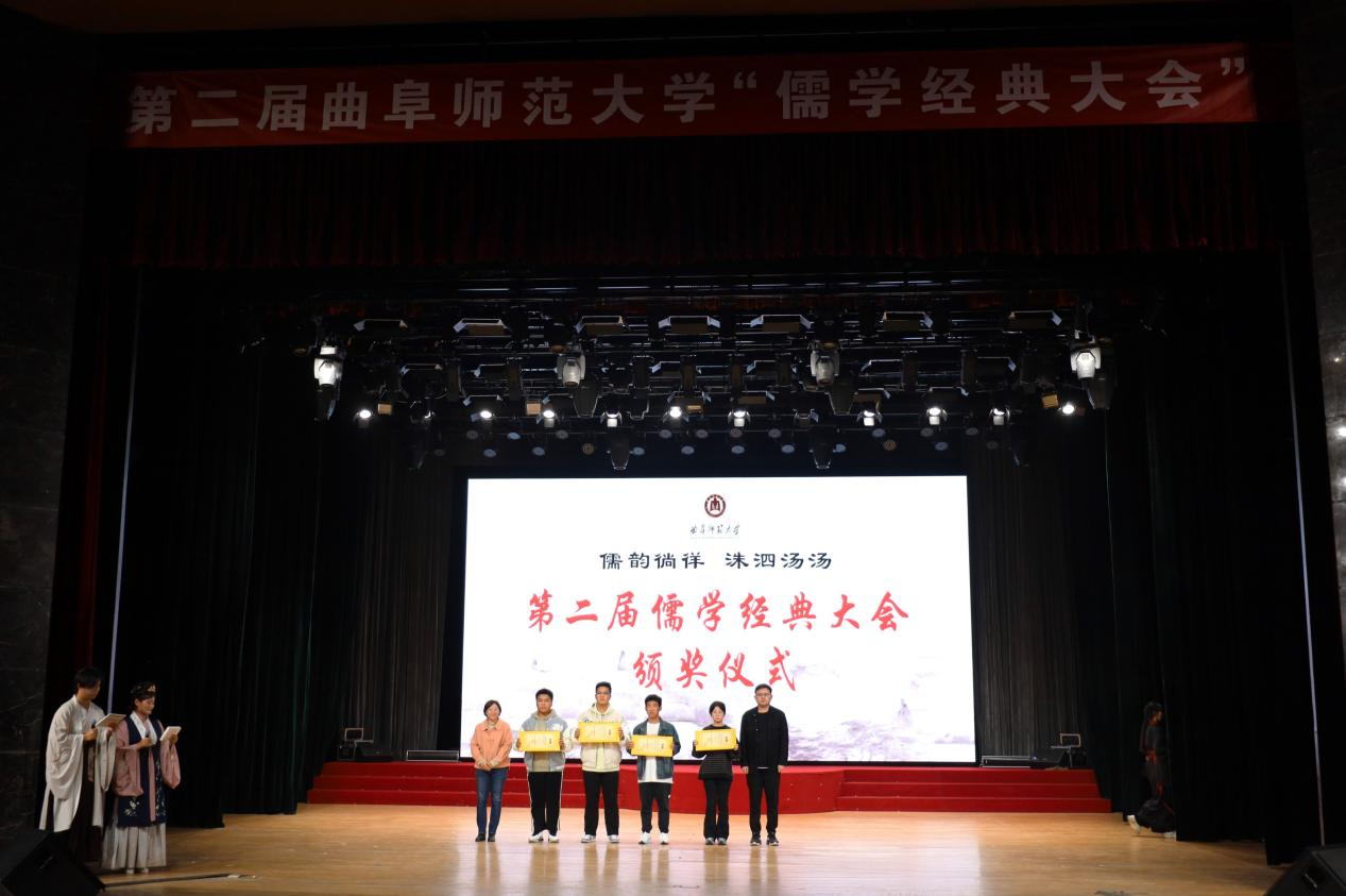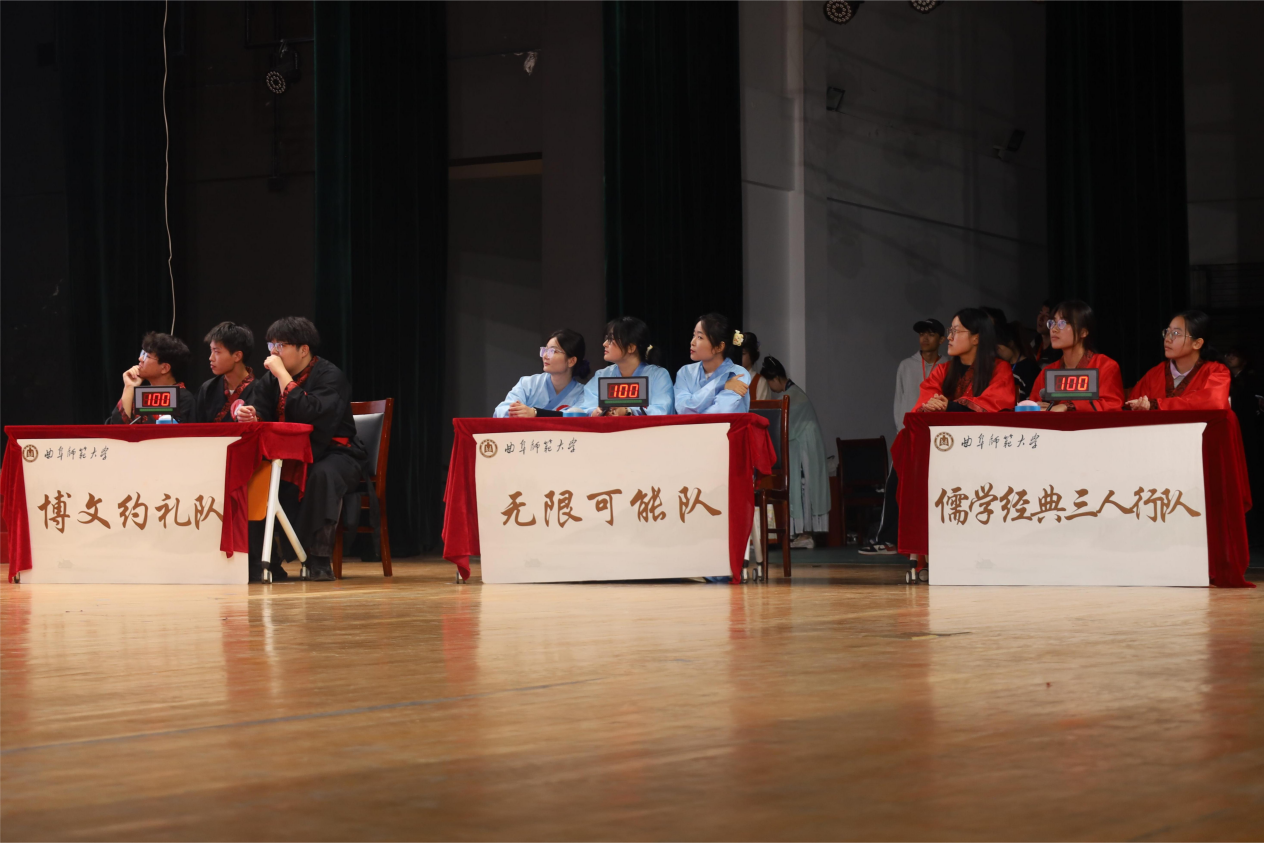 本次决赛共分为博闻强记、君言卿悟、经学剡注、飞花问学四个环节。比赛过程中,参赛队员们思如泉涌、满腹经纶、出口成章,展现出高深的文学素养和渊博的知识储备。比赛期间,大乐透 舞蹈队、24级历史师范5班、大学生传统礼仪研修中心和洙泗学社为大家带来了水龙吟舞蹈、儒家经典诵读展示、孔子讲学情景剧表演“习礼悟道”和十二花神汉服走秀节目。本次大赛以多种多样的形式对话经典,充分展现了儒学经典文化的魅力。最终,无限可能队、儒学经典三人行队荣获一等奖,陶陶队、博文约礼队、我们这队、思政怡和队荣获二等奖,六时风华茂队、博览众长队、北冥鲲鹏队、这是第一队、勇往直前队、致远队荣获三等奖。