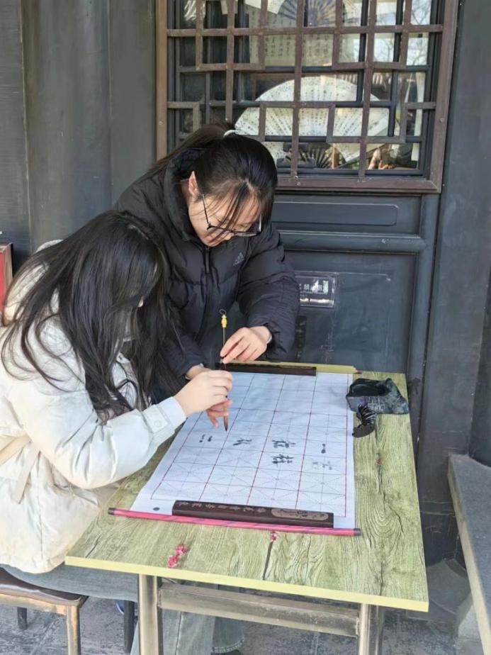 最后,实践队员们与当地青少年围绕“新春笔会”这一主题,开展了一次书法风采展示。为了提升实践队员们的书法水平,活动现场安排了专业书法老师进行现场指导。实践队员们积极向老师请教,互相交流经验,使活动成为一个充满学术氛围的社交盛会。在欢声笑语中,实践队员们与当地青少年展现了各自独特的书法风采,共同为新一年的到来献上了美好祝愿。在共写春联环节,实践队员们与当地青少年齐心协力,共同书写出许多富有创意和祝福的春联,为整个活动增添了浓厚的年味。与此同时,参与者们挥毫写就一幅幅福字,传承千年的文化传统,表达了对未来的美好期许。在制作过程中,实践队员也努力让青少年们了解到,传统文化的传承与创新工作不是一个人的事情,也并非一朝一夕能够完成的,需要在全体成员的共同努力与维持下才能取得优异成绩。在这一阶段,实践队员们表示:“这次笔会不仅让我更深入地了解了书法艺术,还结识了许多志同道合的朋友。感谢王羲之故居提供了这样一个交流学习的平台。”总而言之,书法风采展示的开展,培养了参与者各项能力的协调性以及综合能力,起到了真正的寓教于乐的目的。并且,也进一步增强热爱传统文化的意识,这也是促进传统文化传承与创新的重要基础。