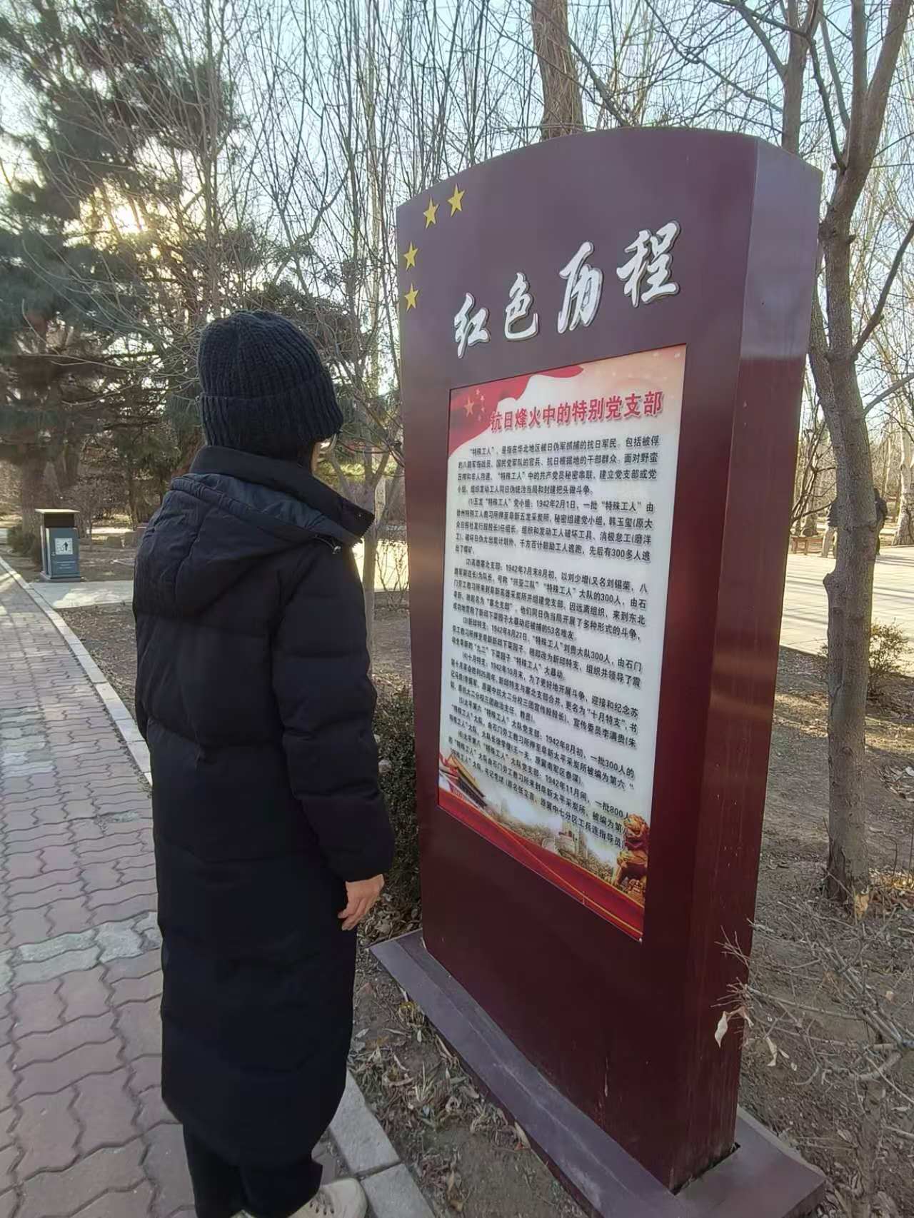 实践队为更加真切地感受历史,决定前往阜新市三一八公园。走进三一八公园,实践队员感受到扑面而来的历史厚重感,门口有假山环绕,还有一块醒目的石刻,再往里走就看到了庄重严肃的英雄纪念碑,碑上浮雕生动刻画着人民解放军解放阜新时英勇无畏、浴血奋战的战斗场面,背面是1988年3月8日阜新市人民政府为纪念革命烈士而所刻的烈士纪念碑文,看着这些,仿佛能听见当年战场上的枪炮声,能看到战士们冲锋陷阵的身影,实践队成员在纪念碑前整齐列队,神色凝重,庄严肃立,向英勇牺牲的烈士们默哀致敬,表达着对先烈们的无限敬仰与缅怀之情 。实践队向前出发,步入红色文化展示区域,看到了精心设置的星火燎原、解放阜新、阜新精神三大板块展板,一幅幅珍贵的历史图片、一段段详实的文字介绍,都在诉说着过去的故事。实践队了解到从1945年“八一五”光复后八路军接收阜新,到1948年3月18日阜新最终全境解放的历程,从烽火特支领导的抗日斗争,抗日烽火中建立诸多特别党支部(五龙“特殊工人”党小组、太平第六“特殊工人”大队党支部等),到中共中央东北工委直属阜新地下党支部等发生在阜新地区的历史事件。实践队继续前进,进入了一片树林,在草地上立着几个大字“永远跟党走”,这不仅体现出在抗战时期革命人士的坚定决心,也突出了阜新人民紧跟党的步伐的爱国情怀。