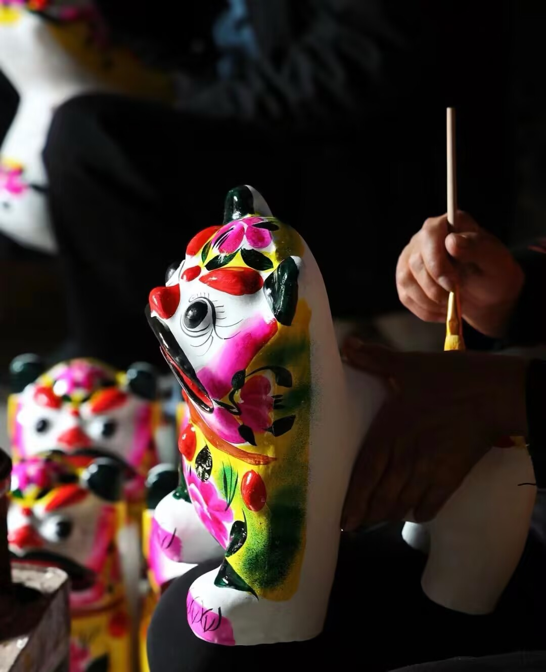 高密泥塑题材广泛,涵盖了诸多领域。其中有活泼灵动的虎、狮、猴等动物形象,这些动物造型往往在憨态可掬中展现出生命的活力;也有源自神话传说的白蛇传、孙悟空等人物形象,为泥塑赋予了奇幻色彩;还有富贵有余、连生贵子等饱含吉祥寓意和民俗风情的主题,反映了当地人民对美好生活的向往,具有极高的文化意义与研究价值,是高密地域文化的重要标志。