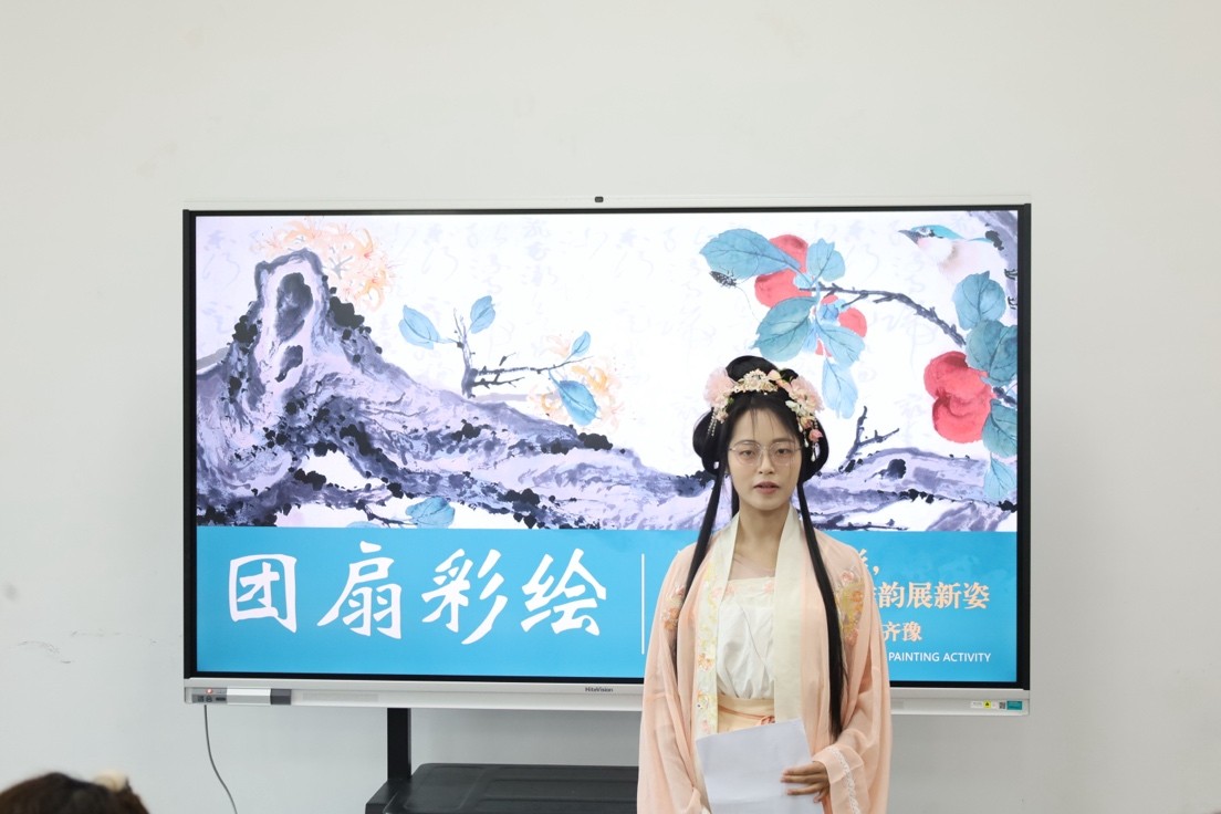 活动现场,同学们在朋辈导师的悉心指导下,全身心投入到团扇绘画创作中。导师们首先向同学们介绍了团扇的历史文化背景和绘画技巧,随后同学们纷纷拿起画笔,在空白的团扇上尽情发挥自己的想象力与创造力,将传统文化元素与现代图案巧妙融合。最后在交流展示环节,各位学员积极分享作品及创作理念,并将成品带走留念。