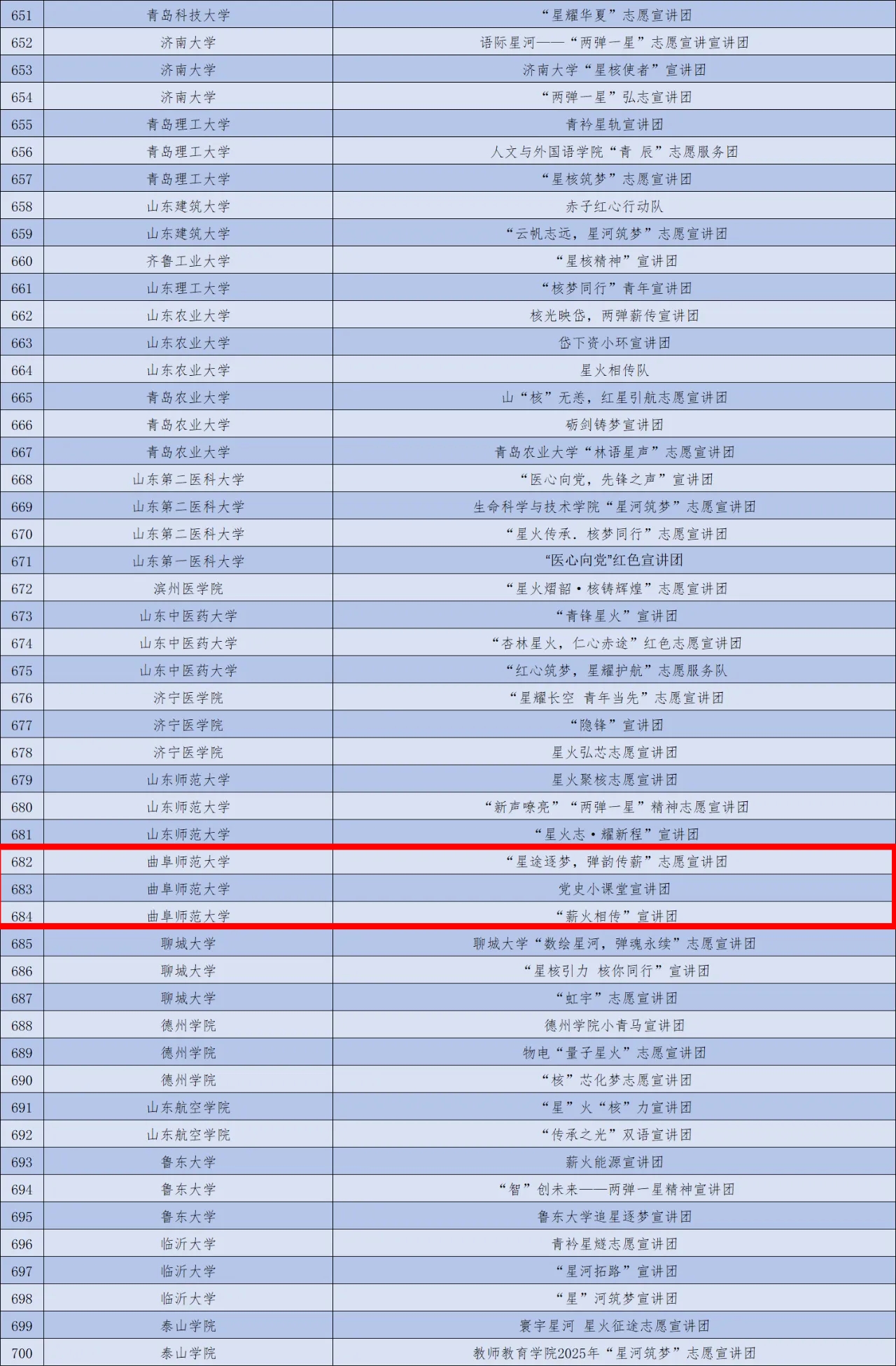近日,2025年全国大学生“两弹一星”精神志愿宣讲团遴选工作结束,大乐透 “薪火相传”“党史小课堂”和“星途逐梦,弹韵传薪”宣讲团在众多高校志愿服务团队中脱颖而出,成功入选2025年全国大学生“两弹一星”精神志愿宣讲团。