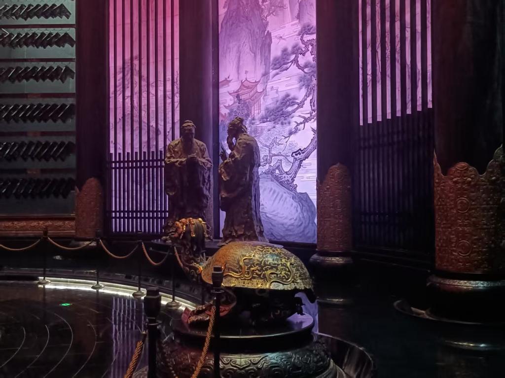 夜幕低垂,实践队集体沉浸于大型礼乐文化演出《金声玉振》的艺术世界。这台以孔子思想为核心脉络的演出,通过诗、乐、舞等传统艺术形式的创新融合,艺术化再现了孔子“由凡入圣”的生命历程及其思想的永恒价值。从少年“习礼”、“志学”到成年“加冠”、“闻韶”,直至“著书立说”、“大道之行”,每一幕的演绎都深深叩击着队员们的心弦。队员观后深有感触:“‘金声玉振’远非一场视听盛宴,它是一场关于生命境界升华的庄严仪式。它让我真切领悟到,‘修身齐家治国平天下’的儒家理想并非遥不可及的空中楼阁,其根基正是始于日常的明礼修身与不懈精进,这为我的大学生活指明了修养方向。”