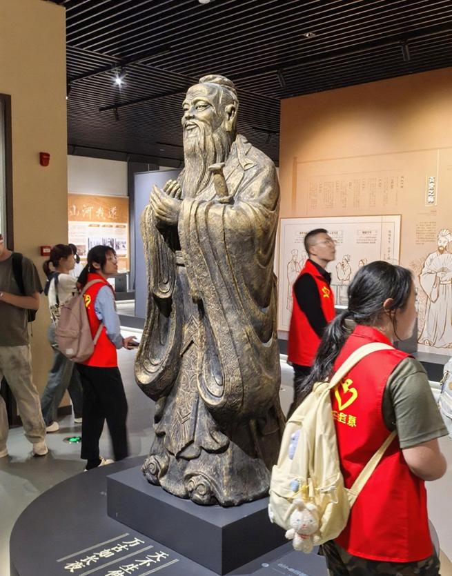 实践首阶以“溯源”为要,聚焦教师博物馆红色展区的系统梳理与深度挖掘。队员们在讲解员指导下,围绕“抗战烽火中的师范教育”“教育楷模的精神丰碑”两大主题展开调研:整理华北联合大学、华东师范大学等院校在战火中坚持办学的史料,还原曲阜师范学校师生护送教材、支援前线的历史场景;通过孔繁森手稿、陶行知“生活教育”理论文献等珍贵展品,提炼“教育报国”“奉献为民”的精神内核。队员们结合专业所学协助博物馆优化“红色课堂”场景复原区,补充数字化解说素材,使静态展陈转化为可感知、可互动的教育空间。