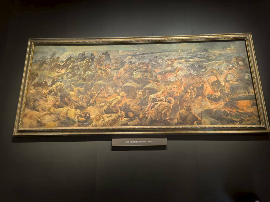 随后,实践队员们走进淮海战役纪念馆展厅。一幅气势恢宏的油画《攻克黄维兵团》映入眼帘,画面中硝烟弥漫,战士们奋勇冲锋,生动展现了淮海战役的激烈与残酷。实践队员们驻足凝视,仿佛能透过画布,感受到当年战斗的紧张氛围和革命先辈们的大无畏勇气。在讲解员的带领下,大家有序参观,从珍贵的历史文物、详实的文献资料,全方位了解淮海战役的全过程。从战役的战略谋划,到前线将士的浴血奋战,再到后方群众的全力支援,每一个故事、每一段历史,都深深触动着实践队员们的心。大家深刻认识到,淮海战役的胜利,是人民战争的伟大胜利,是革命先辈们用热血和生命铸就的不朽功勋,体会到人民群众在革命进程中发挥的巨大力量。