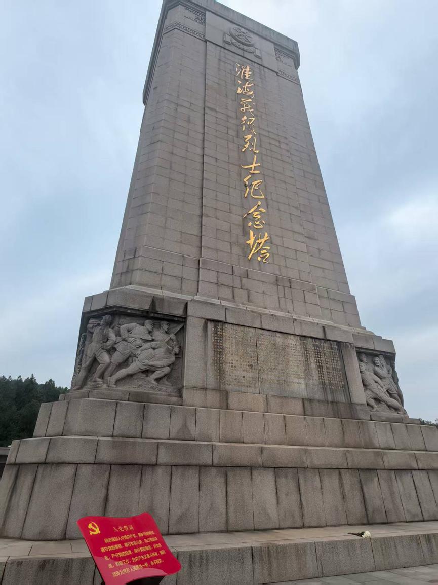 活动伊始,实践队员们来到庄严肃穆的淮海战役烈士纪念碑下。巍峨的纪念塔矗立在天地间,“淮海战役烈士纪念塔”几个金色大字,在阳光下闪耀着神圣的光芒,仿佛在无声铭记着那段血与火的峥嵘岁月。塔座四周的浮雕,生动再现了淮海战役中战士们为英勇奋战,抛头颅洒热血的英姿以及人民群众团结一心踊跃支前的局面。石碑上的每一道刻痕都承载着历史的厚重。讲解员深刻入微的讲解使实践队员们再次接受心灵洗礼,更加深刻理解了淮海战役的精神,强化了红色精神的信念。