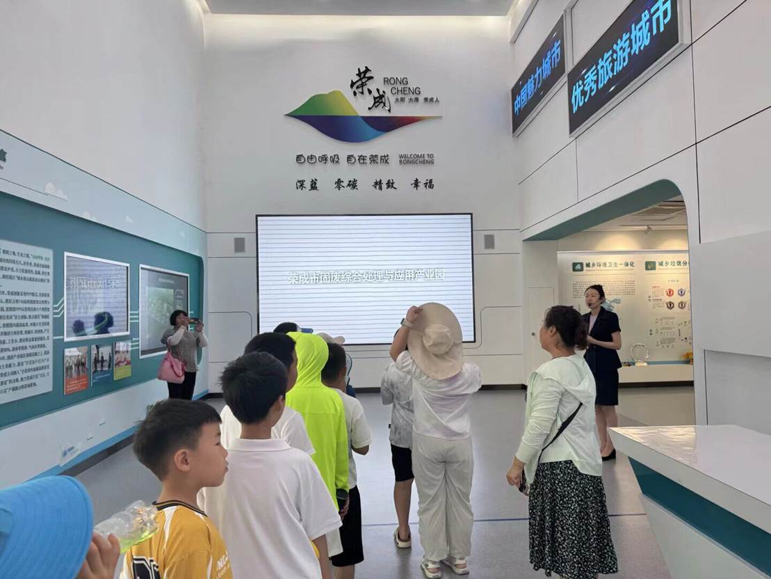 夏日的阳光洒在路途,孩子们的笑声与期待的眼神,成为实践队员们前行的动力。抵达垃圾回收处理中心,讲解员热情相迎,实践队员们引导孩子们有序排队、遵守参观秩序。踏入展示厅,“自由呼吸·自在荣成”的标语与“深蓝、零碳、精致、幸福”的城市愿景,瞬间吸引了孩子们的目光。