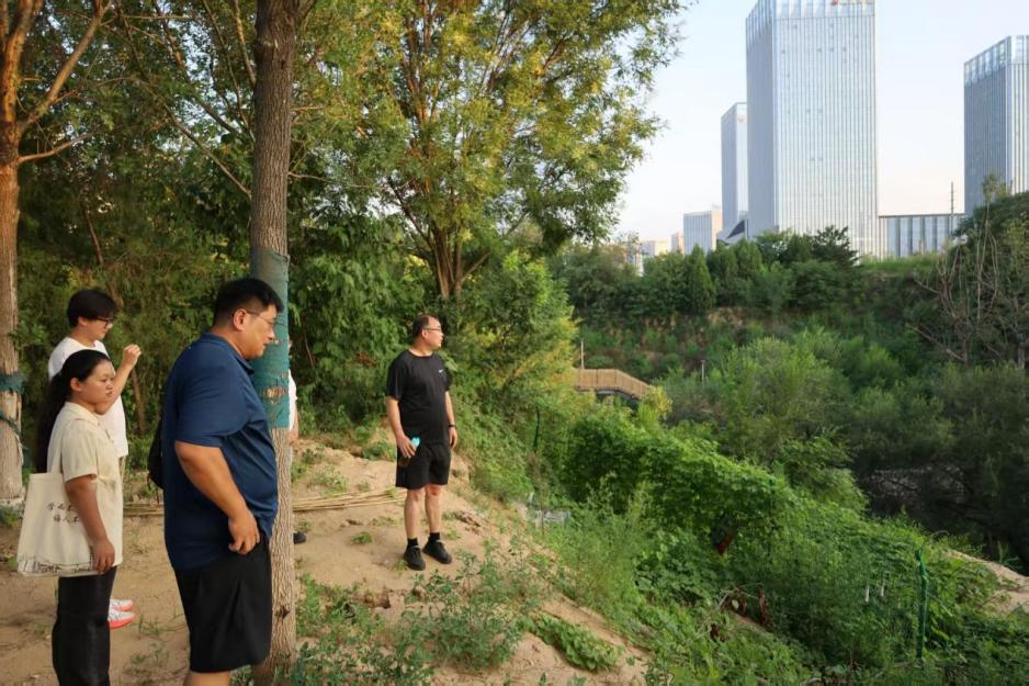 下午,实践队转赴毗邻的庙底沟考古遗址公园,直面仰韶文化庙底沟期期的文明现场。队员们穿过林荫步道,来到一条深沟旁,这就是“庙底沟”;继续向前,又见数个探方,这些都是根据考古报告的内容复原的。躬身踏入庙底沟遗址现场,近距离观察了遗址地层、土质以及各种遗迹现象,队员们仿佛置身于六千年前的聚落之中。触摸着沟体断崖面,感受着其特殊的质地,历史的厚重感油然而生。