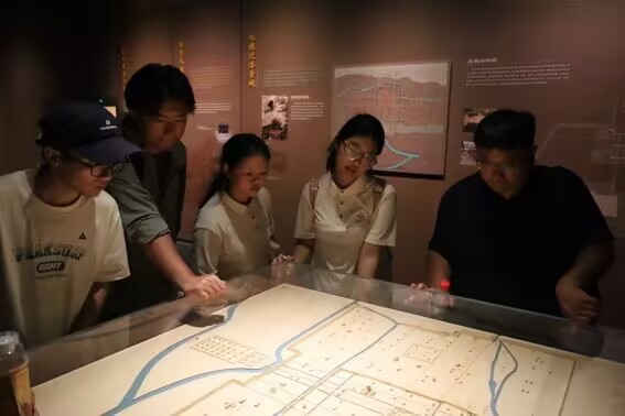 实践队员首先来到“天下河洛,大都惟中”展厅。这里通过文图展板、珍贵文物、城墙剖面以及先进的“全息投影 + 地理沙盘”多媒体设备,生动地展示了汉魏洛阳故城的营建历史及考古历程。在展厅入口,结合圭表和日晷原理设计的“大都惟中”光影艺术装置吸引了实践队员的目光。随着阳光的移动,光影投射在地面,精准地指示出时间和节气,让实践队员们惊叹于古人的智慧。