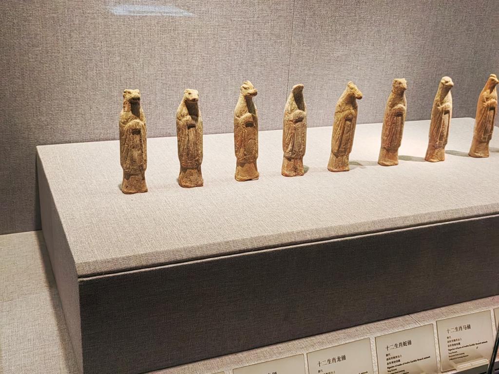 在专题展厅,一组唐代十二生肖俑引发了实践队员的重点关注。这组陶俑包括马、蛇、龙等造型,均为立姿,身着宽袖长袍,头戴冠帽,面部分别雕刻有对应生肖的动物特征,既有兽首人身的奇幻色彩,又不失盛唐服饰的雍容气度。