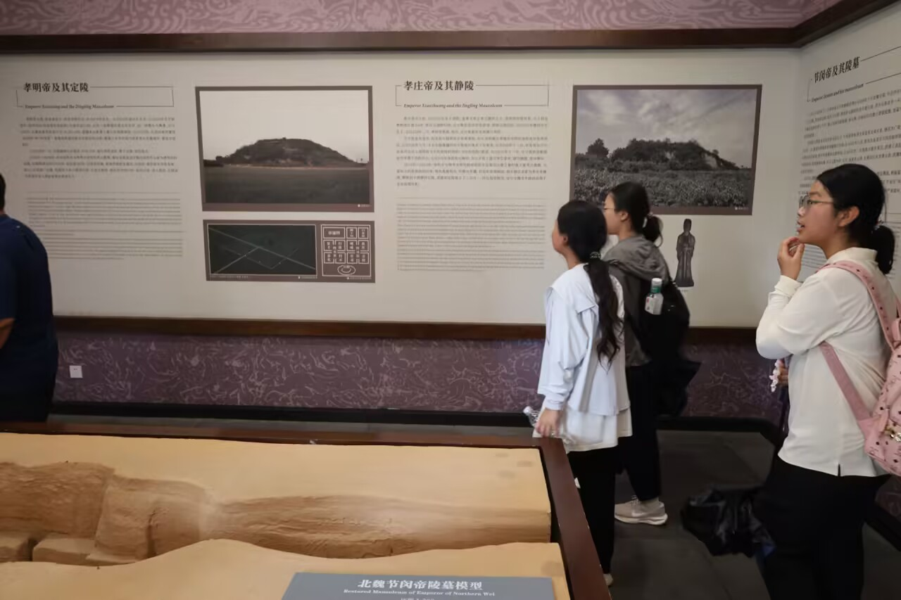 在北魏宣武帝景陵前,实践队员们驻足凝视那座高21米的圆形封土堆,墓道两侧的壁画上,文官武将衣袂飘飘,线条流畅如行云流水。“这座陵墓采用‘封土为陵’的形制,墓室内的穹顶象征‘天圆地方’,体现了古人对宇宙的认知。”讲解员的介绍让实践队员深有感触:“课本上的‘北魏孝文帝改革’在此有了具象化呈现,墓葬中的鲜卑族与汉族文化交融痕迹,正是民族融合的生动见证。”