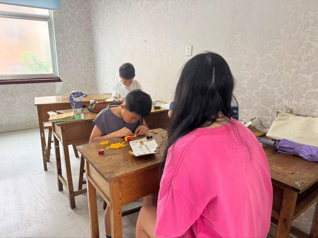 在创意搭建环节,有的孩童专注拼出“超级战车”,有的精心搭建“梦幻城堡”。实践队员们在旁轻声交流,夸赞独特设计——“这个战车的彩色轮子太酷啦,像会发光的宝石”“城堡上的小花装饰,让它变成了花仙子的家” 。通过这样的互动,守护孩童的创意天性,让益智搭建不仅是动手实践,更是创意启蒙,为社区教育服务注入活力。