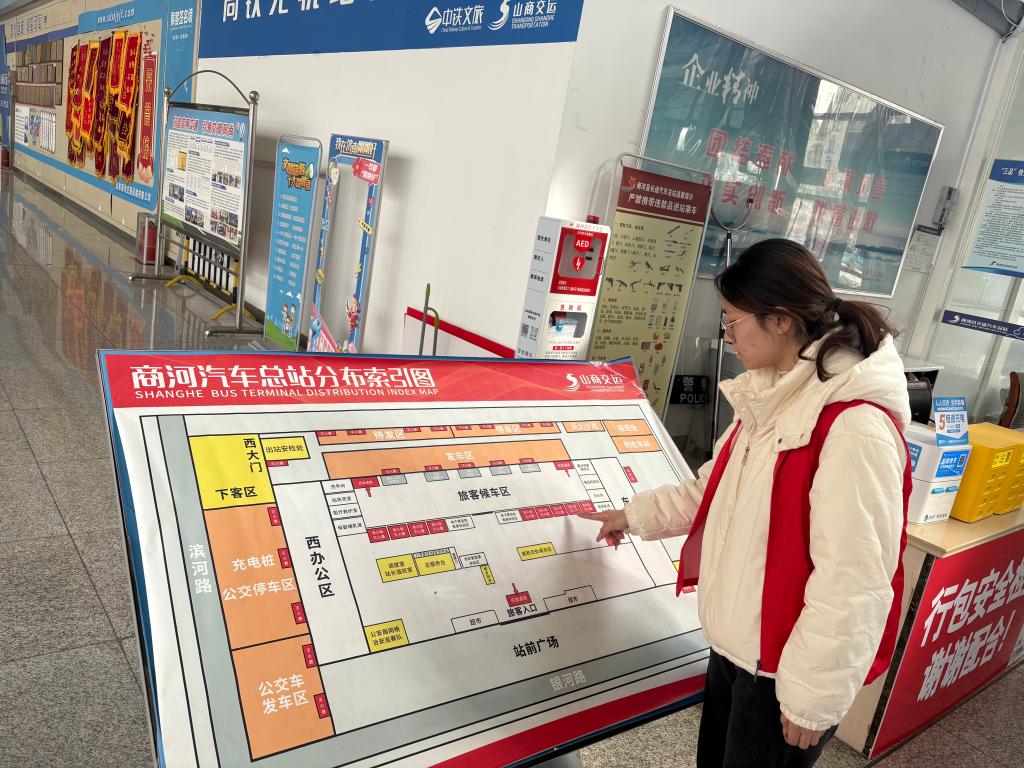 为确保志愿服务精准高效开展,实践队员提前到岗,以扎实的岗前筹备筑牢服务根基。清晨七点,天色微亮,队员们便抵达商河汽车总站,在车站负责人的带领下开展岗前培训与场地熟悉工作。大家对照商河汽车总站分布索引图,逐一学习候车区、售票窗口、安检口、行李寄存处、母婴哺乳室等功能分区的位置与服务职责,队员们认真聆听讲解、及时记录要点,部分队员还实地走访各区域,反复核对位置信息,将车站布局牢记于心。同时,车站工作人员为队员们讲解春运服务注意事项、旅客沟通技巧及应急处置要点,队员们结合服务岗位需求,明确分工、定岗定责,为后续开展志愿服务做好充分准备。