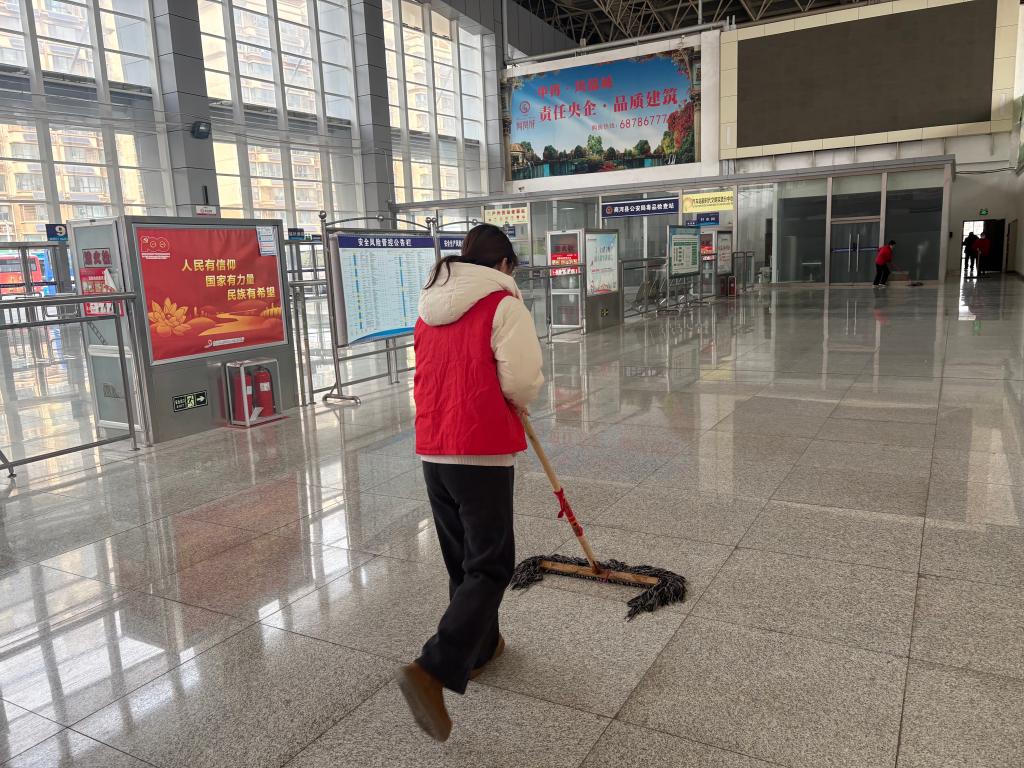 在车站咨询台,队员们耐心接待每一位前来问询的旅客,针对车次时刻、换乘路线、站内设施使用等问题,用清晰易懂的语言逐一解答,同时为旅客指引前往各功能区的路线,缓解旅客的出行焦虑。候车大厅内,队员们手持清洁工具,对地面、座椅、角落等区域进行全面清扫擦拭,从安检口到发车区,不放过任何卫生死角,认真做好环境维护工作,为旅客营造干净整洁、舒适有序的候车环境。