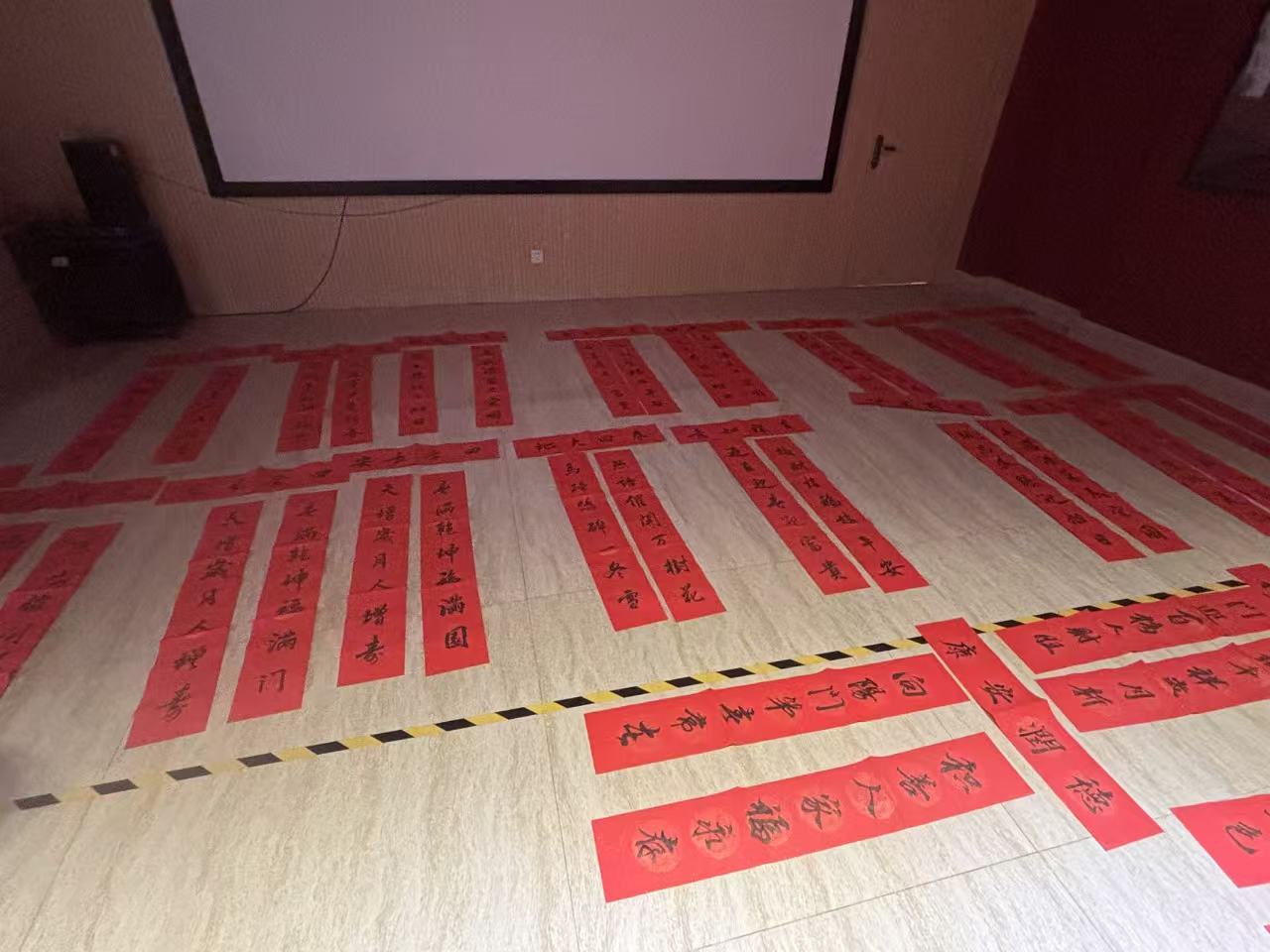 活动现场早早便布置妥当,大红的宣纸整齐铺展在长桌上,毛笔、砚台、墨汁等工具一应俱全,处处洋溢着迎新春的热闹气息。实践队员们围桌而坐,凝神静气、提笔蘸墨,以娴熟的笔法在红纸上挥毫泼墨。楷书端正隽秀,行书飘逸灵动,一个个饱满的“福”字、一副副对仗工整的春联跃然纸上,“春归大地人间暖,福降神州喜事多”“门迎百福千祥至,户纳千祥万事兴”,字里行间满是对新春的美好期许。
