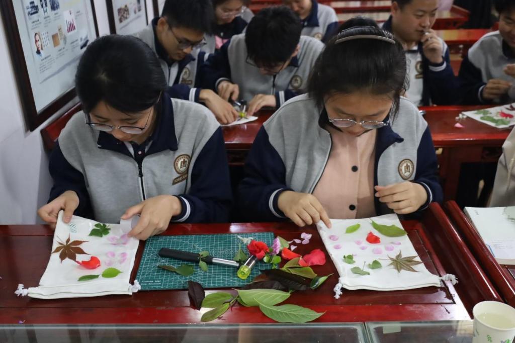 课堂上,志愿者从植物选择、构图布局到拓印技巧逐步讲解演示。同学们认真摆放叶与花,轻轻敲击,随着此起彼落的捶打声,植物的脉络与色彩渐渐清晰地浮现于素布之上,仿佛将春天永远留存。制作过程中,志愿者穿行其间,耐心指导拓印力度与画面构图,在互动中传递技艺之美。