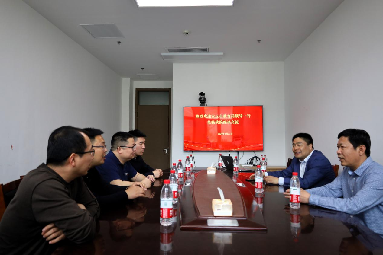 4月21日上午,安丘市委教育工委委员、安丘市教体局组织人事科科长张海波一行莅临大乐透 座谈交流校园招聘工作,副院长王京传,毕业班辅导员参加座谈交流。