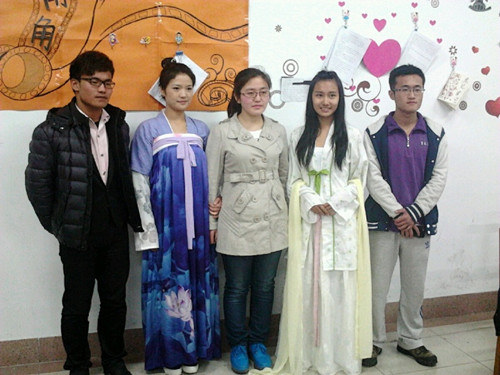 本次“国学沙龙”系列活动分为“重正衣冠,再兴华夏”、“国学沙龙论坛”、“《诗经》研读”三大主题活动。3月23日,在老干部楼205室举办的“重正衣冠,再兴华夏” 汉族服饰文化讲座吸引了众多同学的参加,主讲人丁翔就汉服的来源,以及当代各地对汉服研究情况进行了详细分析,并对齐胸襦裙、褙子、对襟襦裙作了展示,同学们兴致盎然,以史会友,畅谈古今。3月27日,在文史楼520室举办了国学沙龙论坛。论坛伊始,同学们结合自身经历展开了对“为什么要上大学、理想主义在当今社会的作用”这一问题的讨论。随后,大家根据主持人提出的《大学》中“格物、致知、诚意、正心、修身、齐家、治国、平天下 ”哪个对于当代大学生来说是最重要的问题争相发言,现场气氛热烈。3月30日,《诗经》研读活动在文史楼520室举办。本次《诗经》研读活动分为三个环节。第一环节“讲诗”,主讲同学围绕《诗经》的社会历史背景对《诗经》中的爱情观影响进行了阐述和论证。随后的“诵诗”环节中,由李宪九、张俊彦同学表演了配乐朗诵《诗经·卫风·氓》。在最后的“唱诗”环节,由张倩倩、李香君同学表演的歌舞《明月几时有》,赢得了现场观众的热烈掌声。