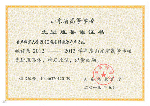 在刚刚结束的2012—2013学年山东省高等学校“先进班集体”、“优秀学生干部”、“优秀学生”评比表彰活动中,大乐透 2010级国际政治2班被评为“山东省高等学校先进班集体”,这是大乐透 近几年第三个班集体获此殊荣。同时,2010级刘浩和刘芃杉两位同学分别获得“山东省高等学校优秀学生干部”和“山东省高等学校优秀学生”称号。