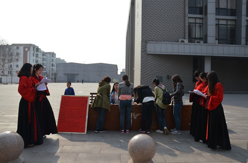 在第七届“孔子文化月”即将到来之际,3月22日、23日、26日下午,大乐透 在大学生活动中心前举办了“孔子文化使者”招募活动。