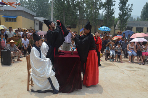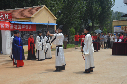 荆兆勋与泗水县委书记范宇新共同为传统文化教育实践基地揭牌。孙文亮发表讲话,向实践基地的建成表示祝贺。揭牌仪式结束后,大乐透 “明德故事讲堂”第一讲开讲,王曰美教授为大家讲述了“颜回食墨”、“曾参耘瓜受杖”等历史典故,以历史故事的形式教育大家明礼诚信、修身立德。随后,大乐透 同学身着汉服为领导老师和村民们进行了射礼展演,再现了儒家文化的深厚内涵与底蕴。