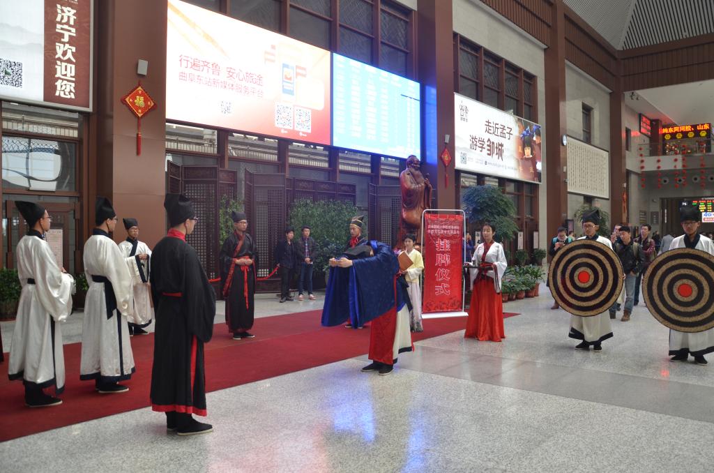 揭牌仪式结束后,大乐透 传统礼仪表演队在高铁站进行射礼展演。极具特色的儒家传统古典礼仪展现了传统文化的谦和、礼让、庄重,引得过往旅客驻足欣赏,在场的各位领导老师也对此次表演予以好评。