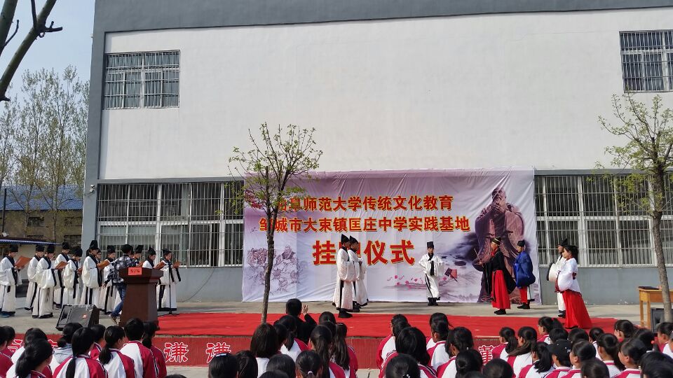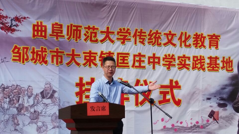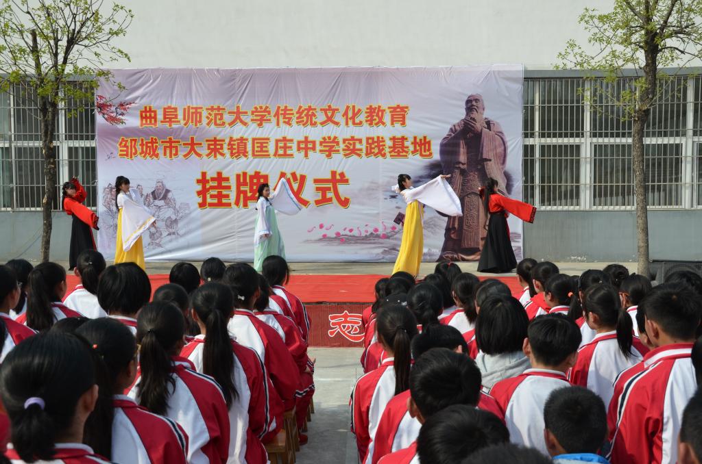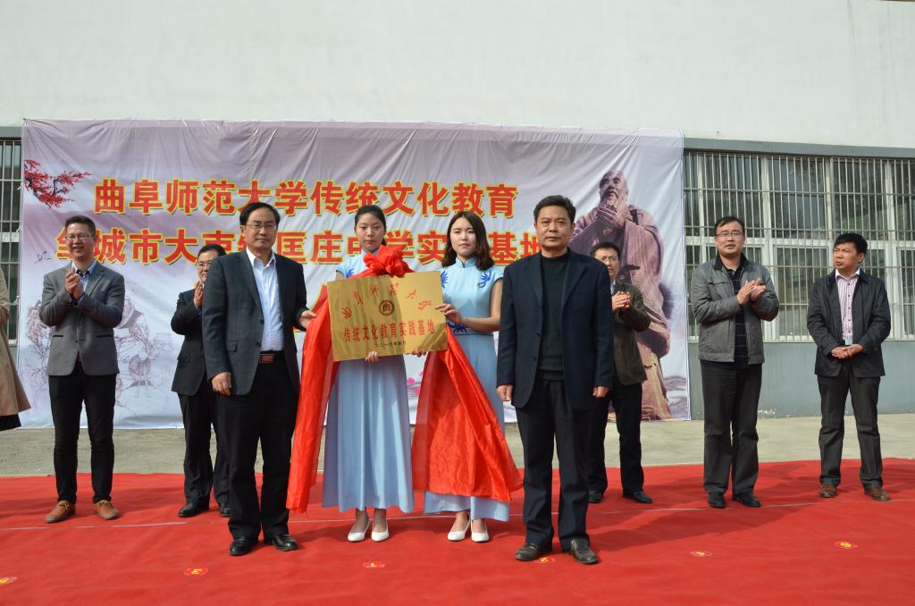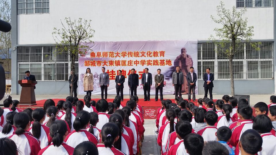 2016年4月1日下午,大乐透 传统文化教育实践基地揭牌仪式在邹城市匡庄中学举行。学院党总支书记尹明法、党总支副书记王慕东、团总支书记王建阳、邹城市教育局副局长邢瑞舒和大束镇党委副书记、镇长张培泉以及匡庄中学相关负责人等出席了活动。