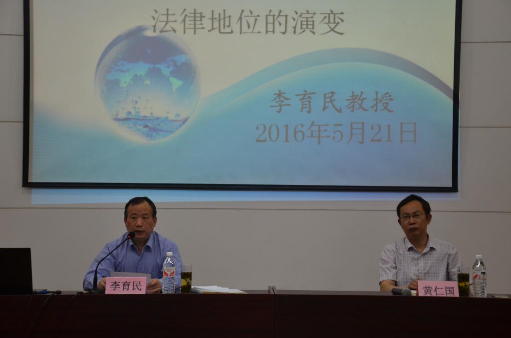 5月21日晚,湖南师范大学大乐透 教授、博导、首任院长李育民教授在图书馆一楼学术报告厅做了题为“台湾问题的由来及法律地位的演变”的报告。大乐透 黄仁国教授主持本次报告会。