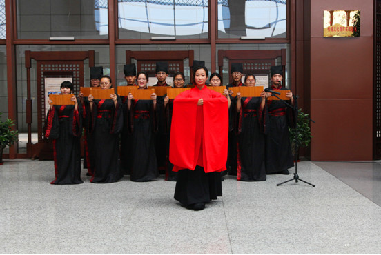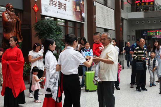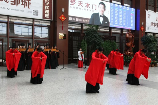 6月8日上午,端午佳节之际,京沪高铁曲阜东站候车大厅内,大乐透 传统礼仪展演队身着儒服吟诵《离骚》、表演汉舞“礼仪之邦”、演绎汉礼,与候车旅客进行《论语》接龙互动,为旅客献上了多道端午节文化大餐。中国青年网、新华网、人民网、大众日报、山东广播电视台、中国山东网等十几家媒体记者对活动进行了报道。 本次展演在传统佳节之际让更多人了解中华传统文化,弘扬儒家精神。