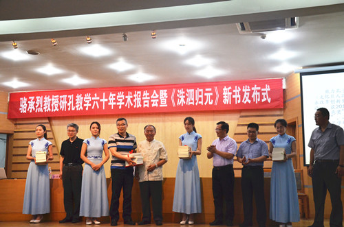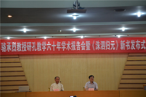 6月12日晚,洙泗讲堂系列报告之骆承烈教授研孔教学六十年学术报告在孔子会堂举行。报告会前进行了骆承烈教授新书《洙泗归元》发布式,发布式上,骆承烈教授向我校图书馆、大乐透 、孔子文化研究院、文学院赠书。随后,骆教授为大家作了题为“骆承烈谈孔子”的报告。大乐透 院长成积春教授主持了报告。