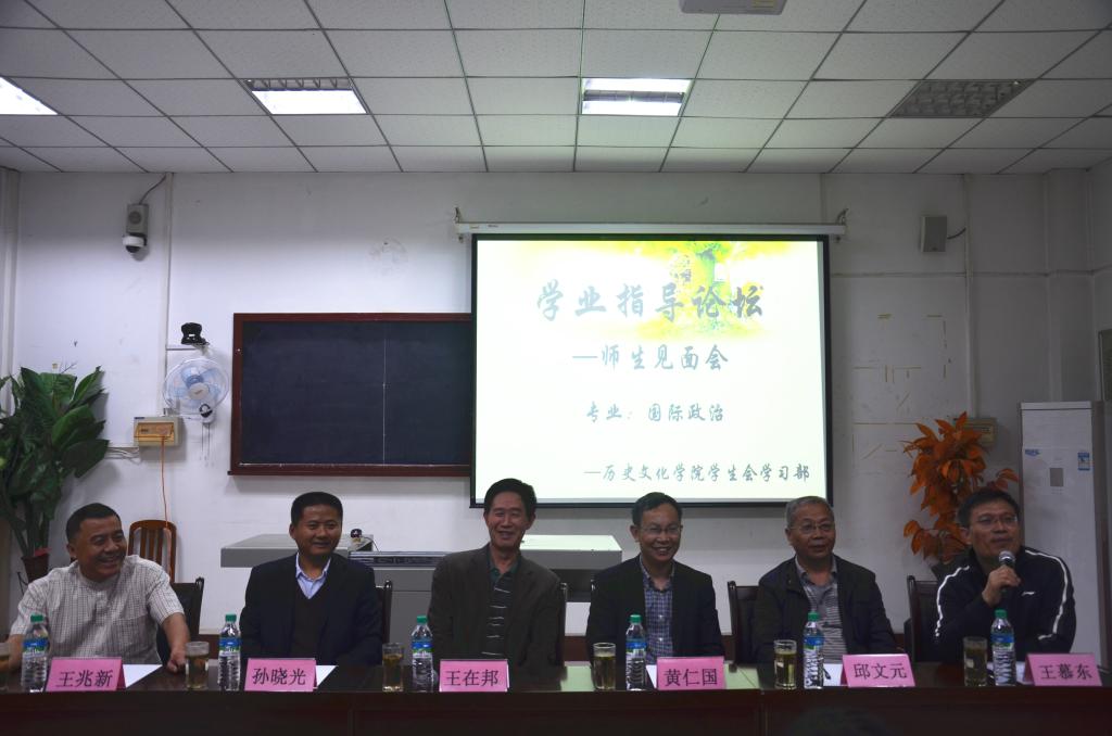 10月11日晚,大乐透 学业指导论坛——2016级国际政治专业师生见面会在文史楼520成功举行。中国现代国际关系研究院研究员、副院长、博士生导师王在邦教授,大乐透 党委副书记、2016级国际政治班辅导员王慕东,王兆新副教授、孙晓光副教授,2016级国际政治班专业导师黄仁国教授、邱文元副教授出席了本次见面会,见面会由王慕东主持。