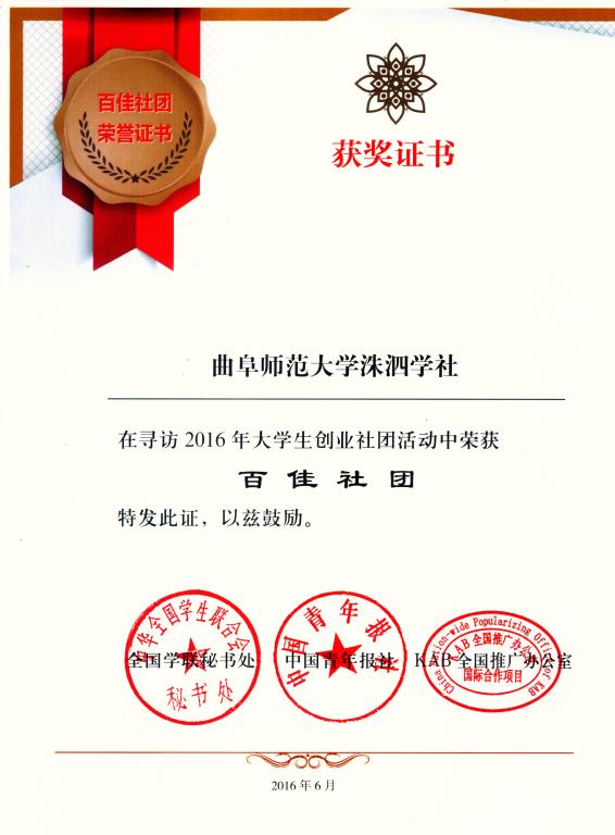 大乐透 洙泗学社荣获2016年大学生创业社团“百佳社团”
