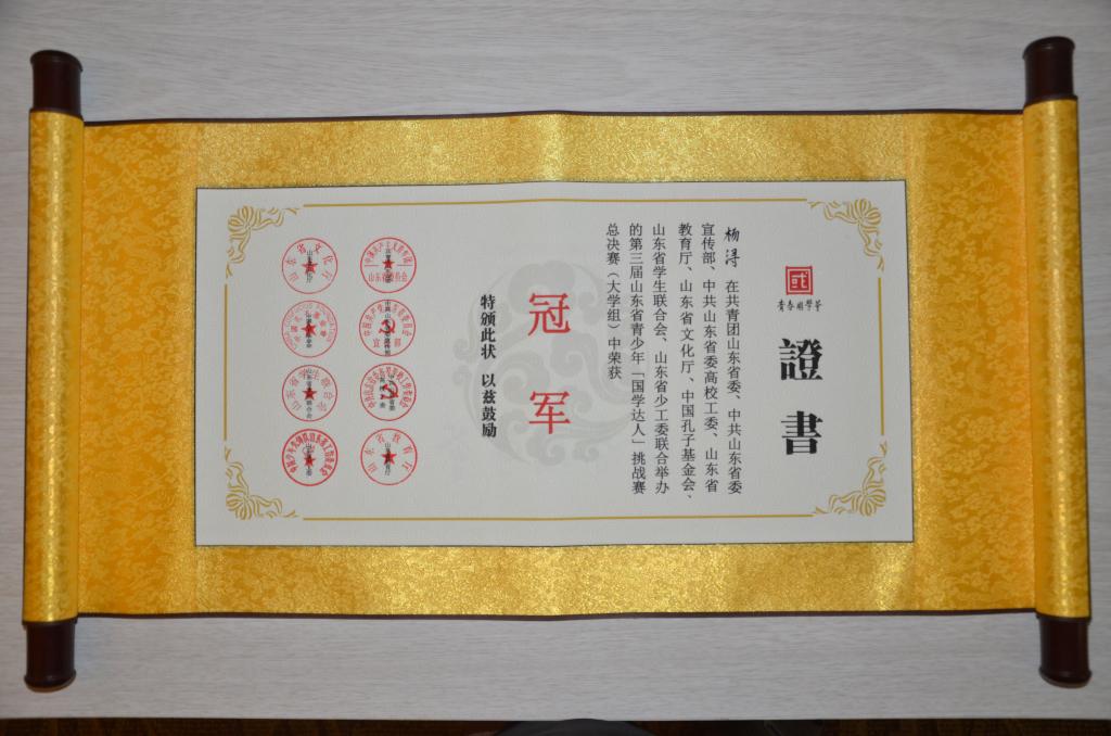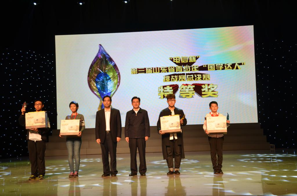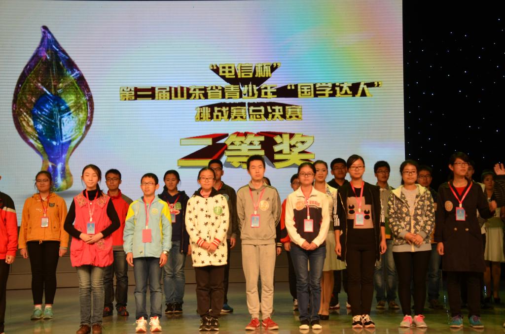 10月22日-10月24日,2016年山东省第三届 “国学达人挑战赛”在山东理工大学闭幕。代表学校参赛的大乐透 三名同学取得优异成绩,杨浔以第一名的成绩获特等奖,潘晓伟获二等奖,王小梅获优秀奖。杨浔将代表山东省参加国赛。我校也以总分第一的成绩获得优秀组织奖。