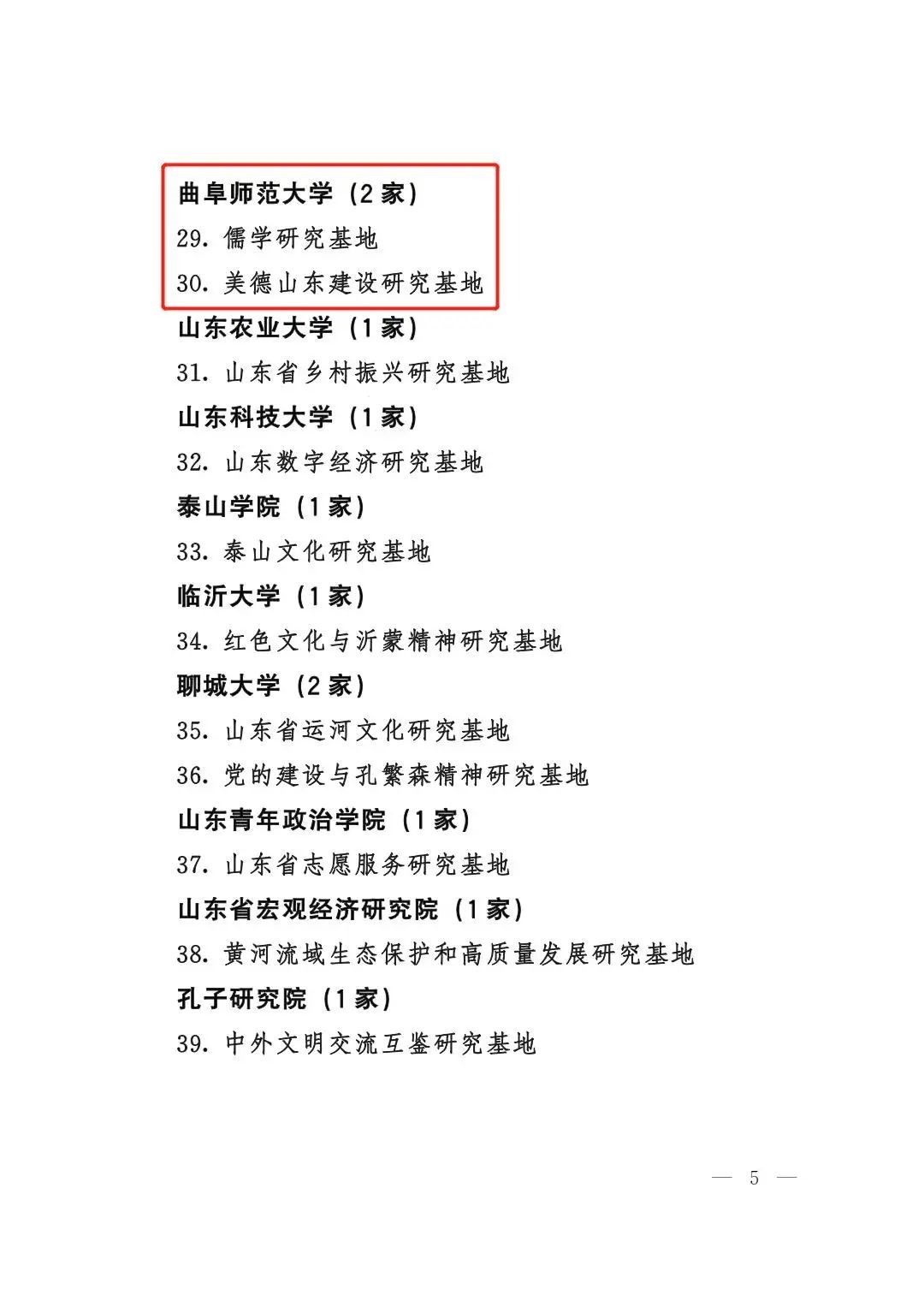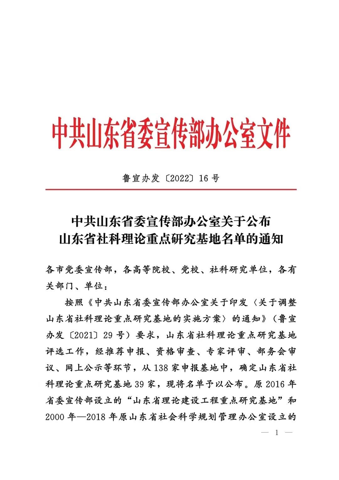 近日,中共山东省委宣传部公布了首批“山东省社科理论重点研究基地”入选名单,共有39个重点研究基地入选。我校申报的儒学研究基地和美德山东建设研究基地,在138家申报基地中脱颖而出,成功入选。本次山东省社科理论重点研究基地的设立,旨在进一步整合全省社科理论研究资源,推动我省理论工作和哲学社会科学事业繁荣发展,以充分发挥全省社会科学力量在理论研究、决策咨询、宣传教育等方面的作用,更好服务新时代现代化强省建设。据悉,此前2016年设立的“山东省理论建设工程重点研究基地”和2000-2008年设立的“山东省社会科学规划重点研究基地”不再保留。