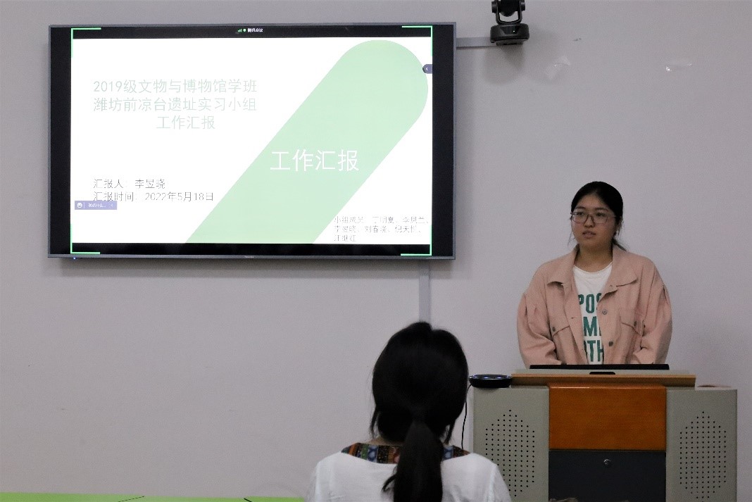 接着,四个实习队分别展开汇报。据潍坊前凉台村北遗址实习队队长李昱然介绍,凉台遗址是一处新石器时代晚期大汶口文化及龙山文化遗址,距今约5000余年。她从发掘地层、遗迹清理、绘图及资料整理等几方面介绍本队的考古过程,并分享考古工地上的工作趣事和温暖瞬间。曲阜西陈遗址实习队队长解洪雪汇首先对西陈遗址的地理范围、遗址年代、发掘现状进行介绍。她表示,半年的实习经历是从书本向实践的转变,在考古工地的虽然工作条件艰苦,但是乐在其中。潍坊小付岗遗址实习队队长吴一凡从遗址介绍、工作内容、和实物介绍三部分展开总体汇报,并对自己在田野实习中的所学所思进行了总结。接下来王宗彪、张梦麟、刘金泉、邹世龙从自己发掘的探方出发,从钻探、布方、刮面等多方面介绍自己的田野发掘实习。临淄蓝青府墓地实习队队长徐敬涵首先汇报了发掘的M56墓和M43墓,并由此介绍山东地区的井字形椁结构墓葬。张雨帆就实习中的典型墓葬情况进行汇报,介绍汉墓M97和战国墓地M57及其中丰富的发掘器物。陶玉颖就石子墓葬、斜坡墓道砖石墓进行汇报,其中出土了殉狗等丰富的陪葬品。最后,张雪盈就M65墓地为例进行墓葬地步结构分析,就M7墓地进行积石墓分享。蓝青府墓地丰富的墓葬形制和出土文物,使同学们对战汉墓葬有了更深刻的了解认识。汇报会最后,大乐透 王京传副院长对文物与博物馆专业田野考古实习工作进行了总结,他首先对支持大乐透 田野考古实习工作的山东省文物考古研究院表示诚挚感谢,接着对2019级田野考古实习给予了高度肯定,对即将展开的田野考古实习进行展望。他鼓励道,田野考古是脑力和体力的双重锻炼,“考古人的身上蕴藏着世界永远不知道你所拥有的无穷力量。”