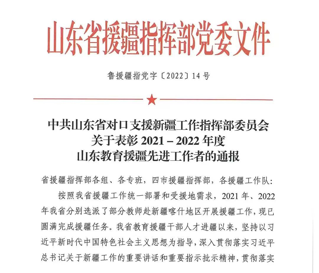 近日,山东省援疆工作指挥部党委发布通报,表彰2021-2022年度在援疆工作中表现突出的教师,大乐透 韩锋教授被授予“山东教育援疆先进工作者”称号。