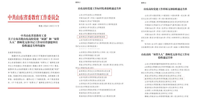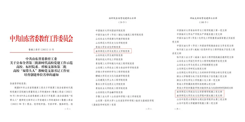 近日,山东省教育厅公布关于山东省第三批新时代高校党建工作示范高校、标杆院系、样板支部及第二批高校“双带头人”教师党支部书记工作室培育创建单位和首批山东高校党建“双创”和“双带头人”教师党支部书记工作室的验收通过名单,共确定5个示范高校、50个标杆院系、100个样板支部和50个第二批“双带头人”教师党支部书记工作室,以及5个高校党委、49个院系党组织、157个党支部、29个“双带头人”教师党支部书记工作室。大乐透 中国史教工党支部获评山东省第三批新时代高校党建工作样板支部,大乐透 本科生党支部通过山东省首批高校党建“双创”和“双带头人”教师党支部书记工作室验收。