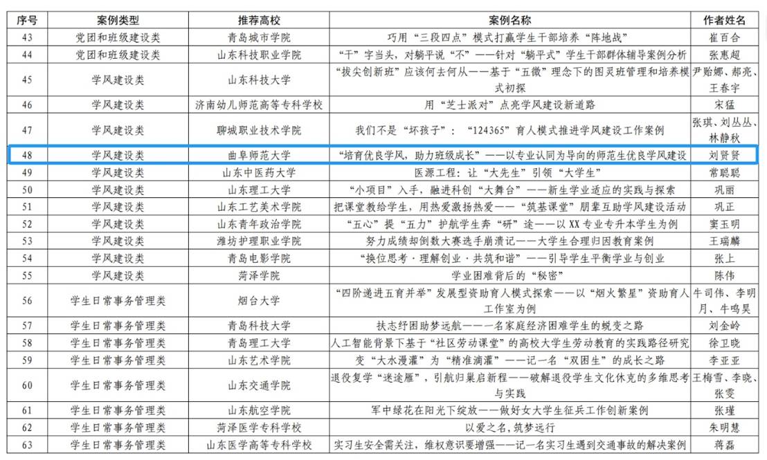 近日,中共山东省委教育工委公布2024年全省高校辅导员工作创新项目评选结果,大乐透 辅导员刘贤贤的学风建设类工作优秀案例《“培育优良学风,助力班级成长”——以专业认同为导向的师范生优良学风建设》荣获三等奖。