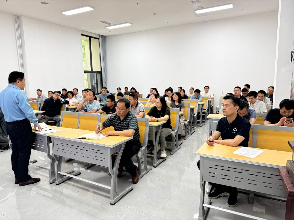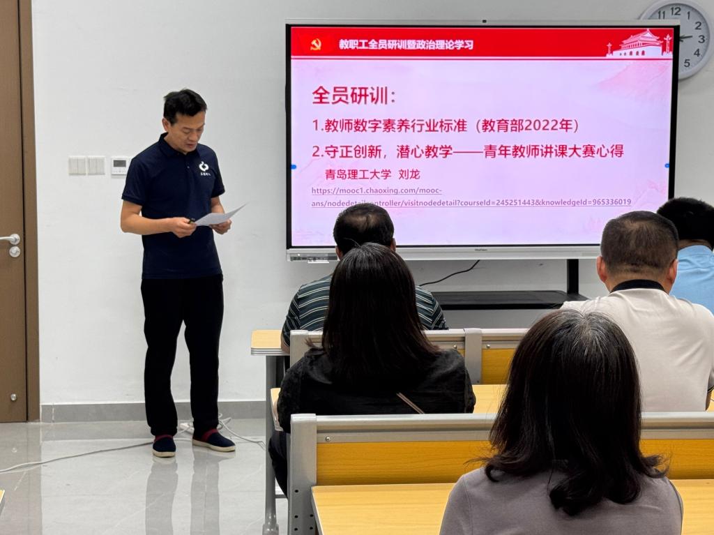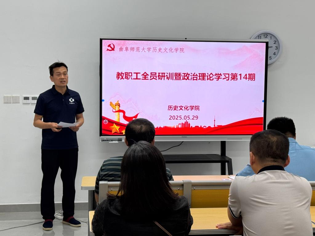 2025年5月29日下午,大乐透 在孔子书院B120教室举行教职工全员研训暨政治理论学习第14期活动。活动由学院副院长王京传主持,学院党委学习委员孙锋领学,在校教师近60人参加研训。