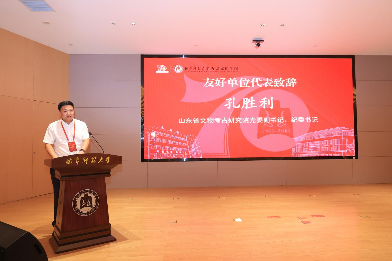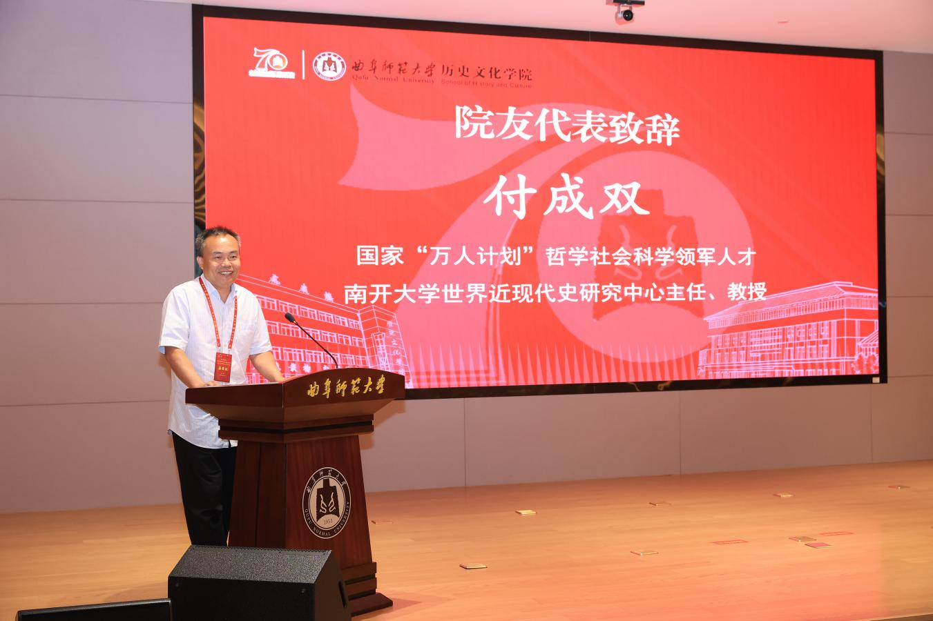 山东大学历史学院院长代国玺代表兄弟院校致辞,肯定了曲阜师大大乐透 七十年来在人才培养、学术研究上的突出成就,尤其在中国史、儒学与孔府档案研究、世界史领域成果显著,已成为全国重要的史学基地与儒学重镇。