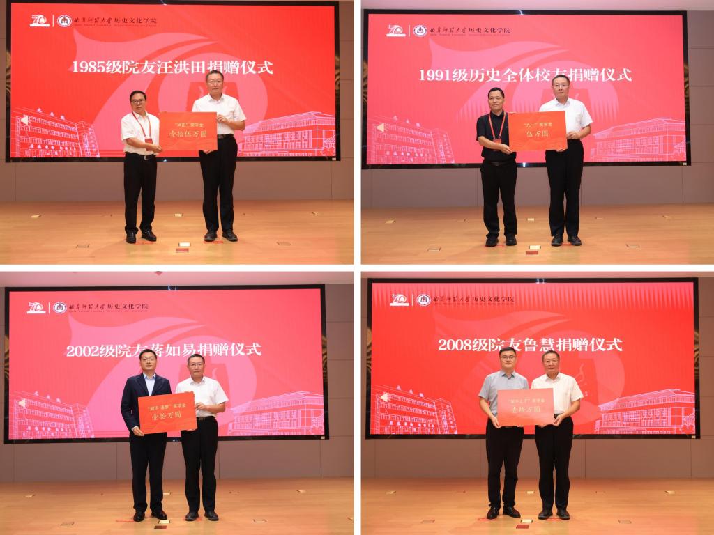 院友捐赠仪式上,1985级院友汪洪田、1989级院友张沨、1991级历史全体院友、2002级院友蒋如易、2008级院友鲁慧、校友杜妮娜夫妇等分别捐赠学院发展基金、奖学金等,助力学院事业发展。