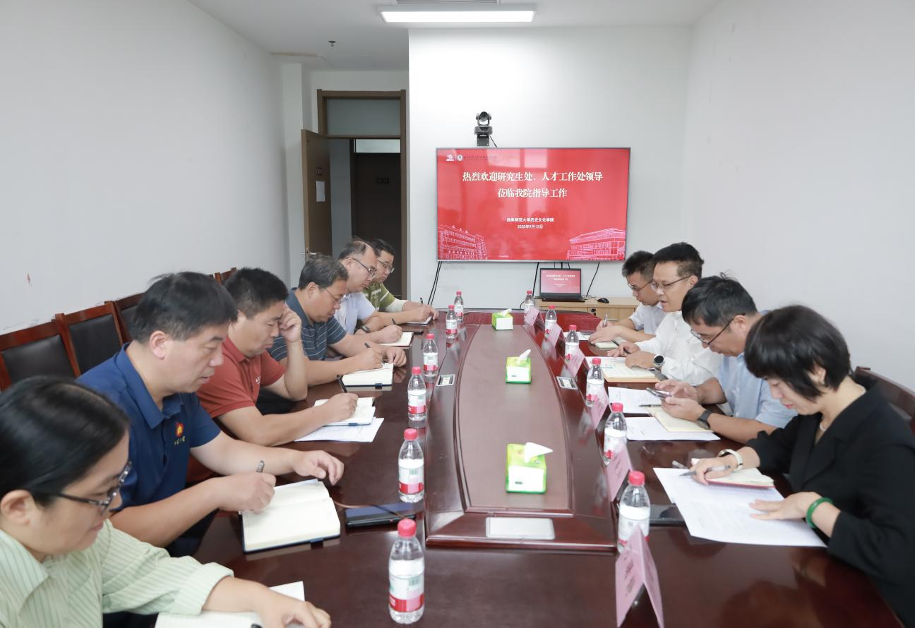 9 月 12 日,我校研究生处处长唐爱民,副处长王其涛、黄美玲,人才处副处长刘在国一行到学院调研工作。学院领导班子成员及部分学科负责人参与了调研活动。