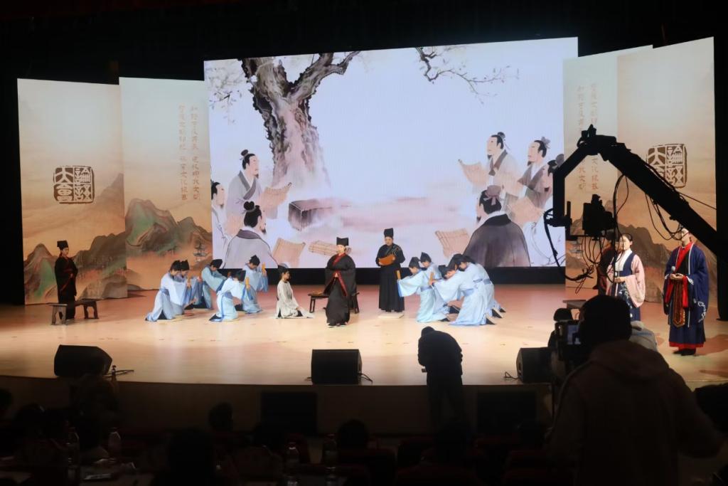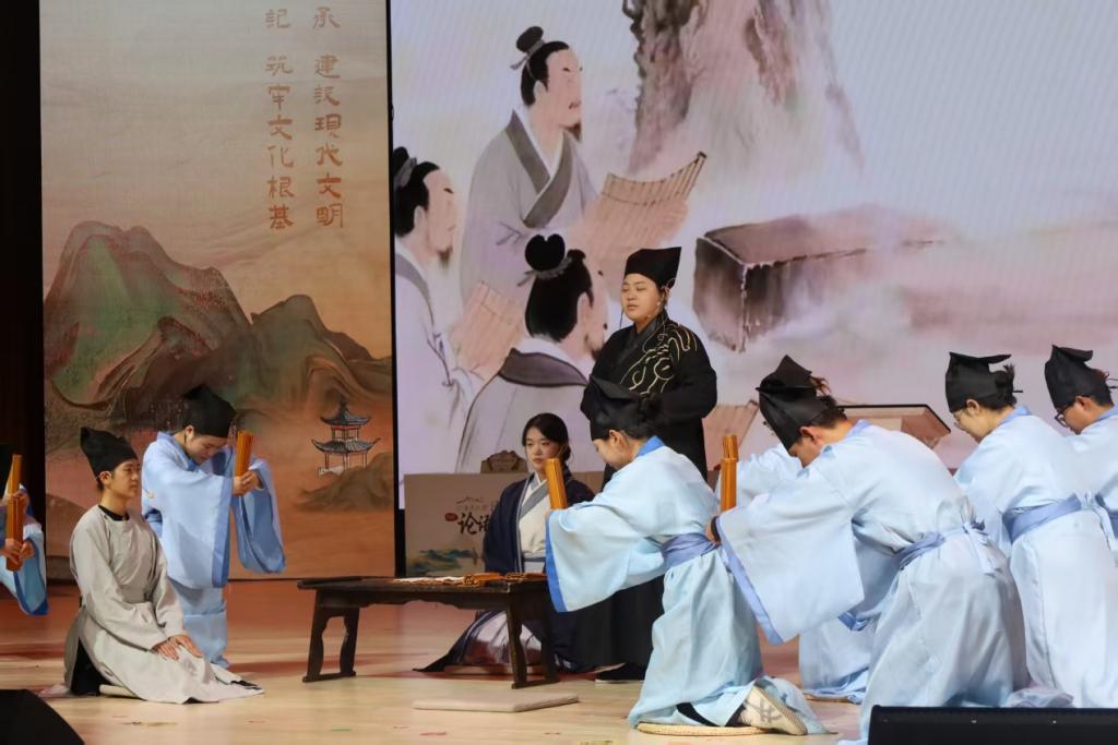 比赛过程中,大乐透 学子展现出扎实的经典素养与生动的诠释能力。在“了如指掌”和“当仁不让”两个环节中,由窦衍洁、林亚蕊、朱韬伊三名同学组成的代表队引经据典、踊跃抢答,以扎实的学识和清晰的逻辑赢得了两个环节的最高分。在“游于艺”环节中,21名同学倾情演绎情景剧《贫而非窘》,生动塑造了子贡“贫而无谄”的君子形象,并庄重还原古代拜师场景,深刻诠释了“礼之用,和为贵”的文化内涵。整场表演编排精巧、情感真挚,赢得现场评委与观众的一致好评。