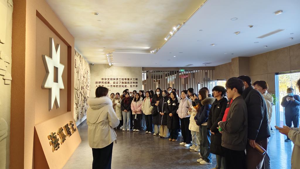 12月3日下午,同学们走进焕新升级的泰安大汶口遗址博物馆。这座建筑面积2600平方米、展陈面积2100平方米的文化殿堂,以“海岱曙光”为核心主题,延续“考古遗址”鲜明特色,从色调搭配到展项设计全方位融入考古元素。馆内不仅系统性展示了200余件石器、玉器、陶器等文物,还生动还原了大汶口先民的生产生活场景与考古发掘现场。同学们循着“发现—探索—守护—仰望”的展陈脉络,深入了解大汶口文化作为“中华礼制源头”的文明内核,近距离观摩八角星纹彩陶豆等代表性文物,对史前社会分化、礼制起源等专业知识形成直观认知,更通过沉浸式互动体验,真切感受考古工作的严谨与文化遗产的厚重。