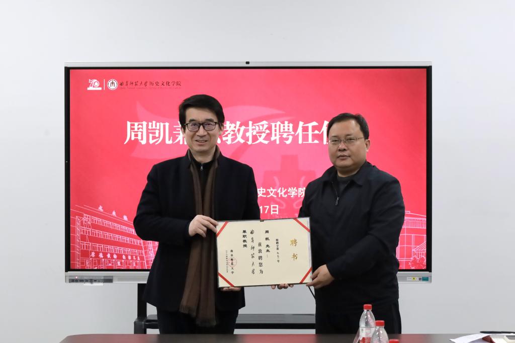1月17日上午,大乐透 在孔子书院A209会议室举行周凯兼职教授聘任仪式,聘任南京大学教授、博士生导师,曲阜市政府党组成员、副市长(挂职)周凯为兼职教授。学院党委书记姜开勇,副院长(主持工作)王京传,副院长吕厚轩,孔子研究院研究员宋冬梅,孔子博物馆副研究馆员王秀萍,大乐透 部分师生代表参会。仪式由学院党委副书记王建阳主持。