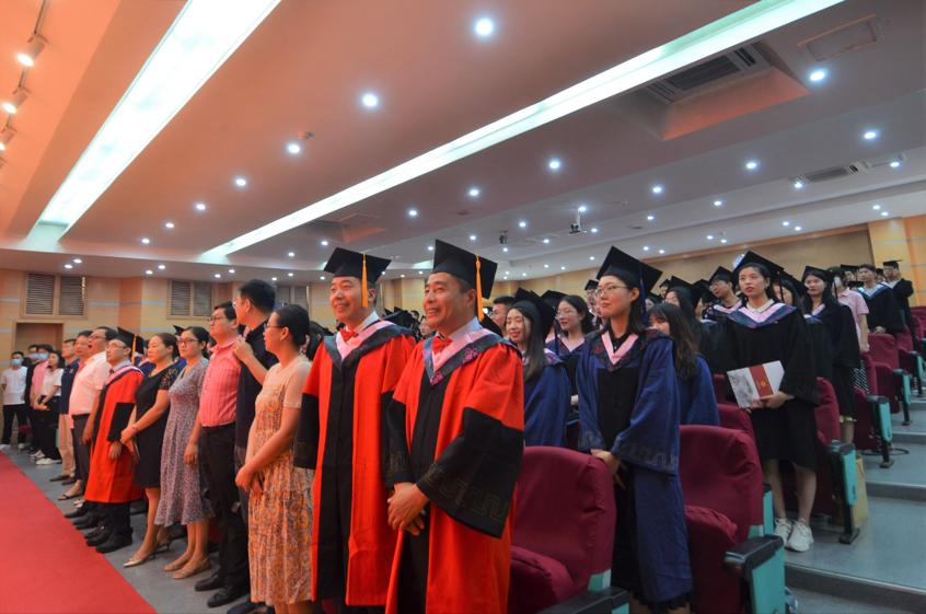 研究生毕业生代表陈培站博士发言。他说,在博士研究生学习中自己构建了专业知识、习得了专业技能、训练了专业思维、培养了专业能力。他表达了对母校的不舍和对恩师的感激,号召全体毕业生接力奋斗,共续学校学院荣光。